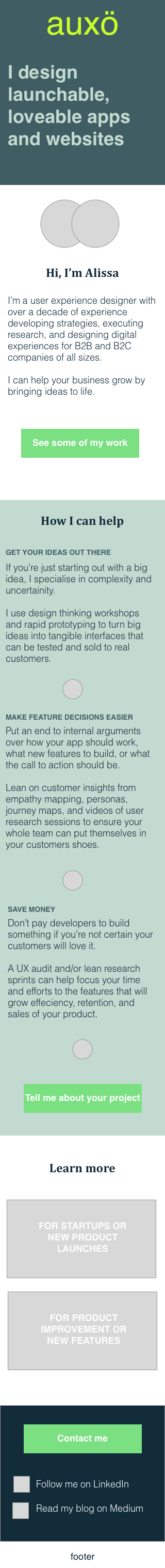 Meet Auxo. I help grow your business with apps and websites that bring ideas to life. I do this by understanding your business and your vision, learning how your customers think and behave, then designing multiple experiences to see what works. It’s better than building based on your assumptions because you can save time, money, and brand equity by delivering the right product, the first time. I know you’ll enjoy it because it will give you clear direction for a launchable, loveable digital product.