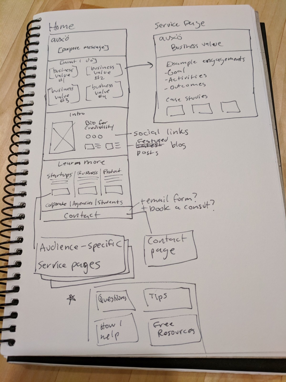 At the end of the day yesterday, I did this first draft sketch of my site, based on the needs of the users and the goals of my business: